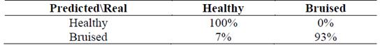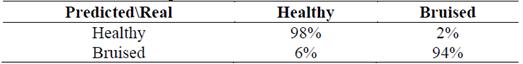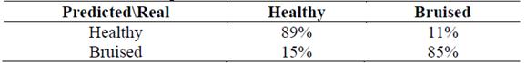 Table 2 shows the confusion matrix obtained for the pixels classification. On the one hand, it was found that the model classifies 89% of healthy pixels correctly and the remaining 11% are classified as bruised, which are false positives. On the other hand, the model classifies 85% of the bruised pixels properly and the remaining 15% are classified as healthy.