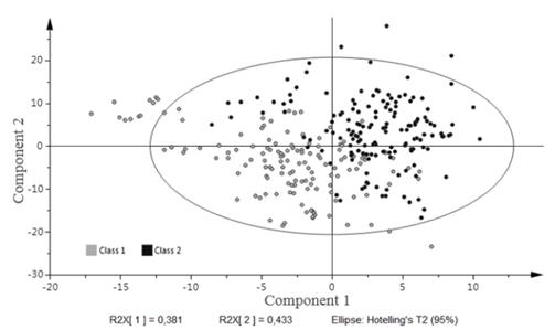 The score-plot graph is obtained when facing the components of the selected models. It shows the confidence oval in which 95% of the component scores must be present in order for the model to be reliable.