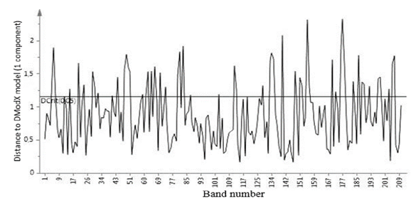 Figure 5. : Distances to model X [1 component] (PLS-DA), NIR spectrum, experiment B