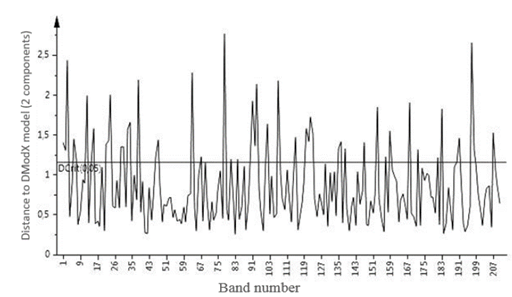 Figure 7. : Distances to model X [2 Components] (PLS-DA), NIR spectrum, experiment C.