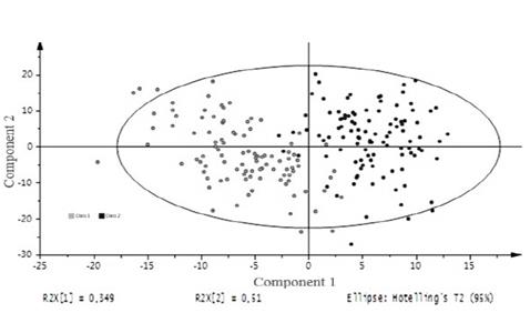 Fig. 4 shows the graph of the score-plots for component 1 versus component 2 in experiment A. it was found that 95% of the component scores are within the confidence oval.