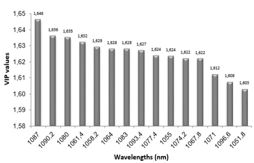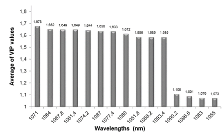 Experiment A: With the values of the distance graph to model X (Fig. 3), we extracted the VIP values that summarize the total contribution of each variable X (in our case, each wavelength) to the PLS model. The variables with higher discrimination power for the chosen model, according to the model importance (VIP) list, are those shown in Fig. 10.