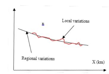 Thus, the short, random local variations are involved in the differential dn, while the slow variation, of regional tendency, is involved in the function within the parentheses, which varies for different points where n takes on different values.