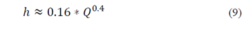 Leopold and Maddock have extensively studied data from a multitude of channels in North America in which both the average velocity, U, and the average depth, h, have been set as a function of the flow [19]: