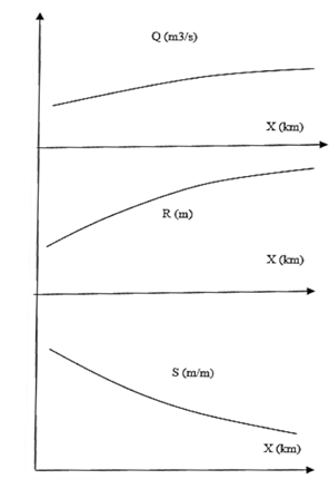 Thus, in long stretches (ones, tens or hundreds of kilometers), systematic patterns of the relations between these various factors can be established. For example, when as the channel evolves over, its contributing basin progressively adds more water, which in principle implies an increase in flow, and also its hydraulic radius to achieve the corresponding transport. Also, as the development of the channel progresses, its slope becomes progressively smaller due to the profile of the mountain-valley transition.