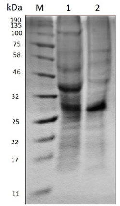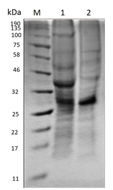 Figure 2: Polyacrylamide gel electrophoresis (SDS-PAGE). M) Molecular marker. 1) Crude extract before hydrolysis. 2) Hydrolyzed extract.