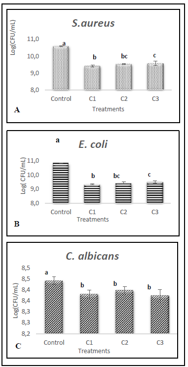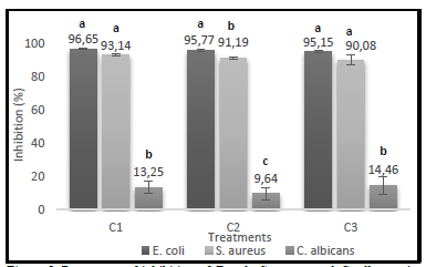 Figure 5: Percentage of inhibition of E. coli, S. aureus and C. albicans in different concentrations of enzymatically hydrolyzed extract (C1:33.35%(v/v); C2: 20%(v/v) y C3:10%(v/v)).