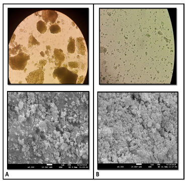 Figure 1 shows the beginning and end of mechanical cell disruption treatment. Samples from the upper side of the figure were visualized with an Olympus CX21 microscope with a 40X objective and those from the bottom, with a scanning electron microscope (SEM) at 8000X.