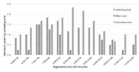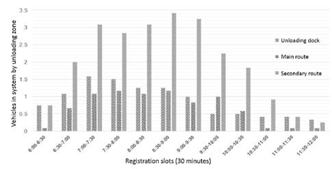 The configuration of the trucks in the predefined logistics zones was reorganized. The unloading dock thus cushioned the vehicles reception from the other two areas. The former came to host 2 vehicles per hour on average, whereas the main and the secondary route evidenced 1.1 and 2.9 vehicles/hour respectively, thus reducing their figures of 2017.