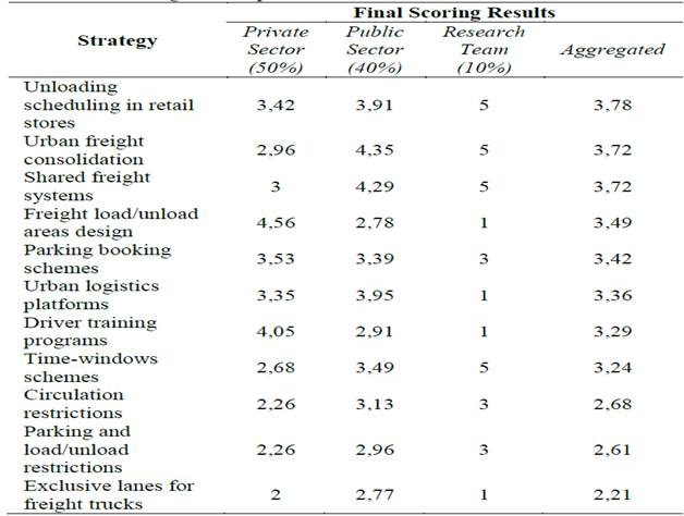 As a result of the evaluation, the strategies with the highest scores, which thereby were deployed in the pilot tests, turned out to be: 1) Unloading scheduling at large receptors, and 2) Freight consolidation (Collaborative transportation). Table 1 presents a breakdown of the overall ponderation results.