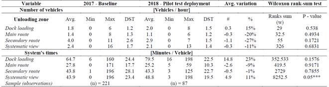 In terms of percentual change, increases were experienced only in the unloading dock variables. In this zone, the average time trucks were parked, and the average number of vehicles housed showed a growth of 23 and 15% respectively. It is worth saying that, for the other areas (e.g. the complete system, and the primary and secondary routes), both figures had a negative trend. These results corroborate that it was possible to increase the loading dock’s average occupation to its maximum capacity (2 freight transport vehicles), which was indeed the aim of the project, to, on the one hand, cushion the number of vehicles that congested the public routes; and, on the other, to boost the utilization of the supermarket infrastructure assets.