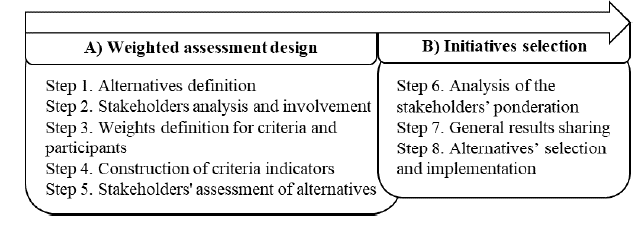 For the selection of the two strategies, a multi-actor multicriteria analysis (MAMCA) was structured; following the work of [20]. This approach is widely used given its capacity for including the objectives of different actors involved in the decision-making process. Fig. 1 gives an overview of the basic scheme followed for this purpose.