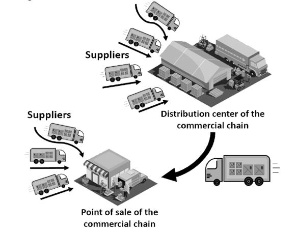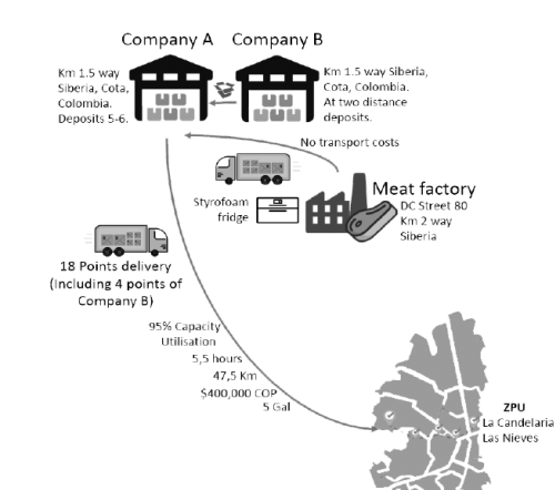 For the observed scenario, the baseline distribution system consisted of freight vehicles that delivered goods directly to the retail sector. In a lower proportion, the goods were distributed through a hub and spoke system, using the retail company’s main distribution center in Bogotá. Fig. 5 illustrates this operative model.