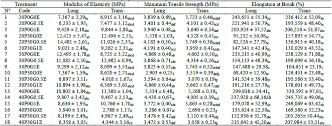 The experimental design yielded a total of 18 treatments, to which the respective evaluation of the mechanical properties of tensile strength was performed. These measurements were performed longitudinally and transversely.