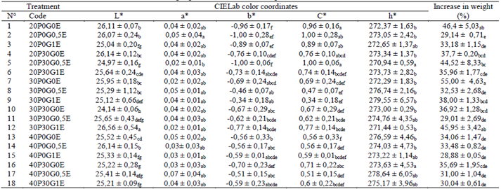 The luminosity (L) varied between 24,14 ± 0,06 and 26,56 ± 0,54, being closer to 0 (black) than 100 (white), a* presented positive values close to zero, b* values negative tending to blue, but close to zero, C* low saturation values between 0,34 and 1, corresponding to a dull color and h* values between 270,94 ± 0,59 and 279,55 ± 6,57 (green blue).
