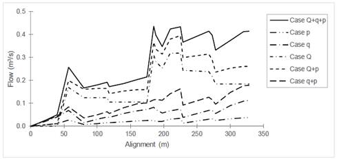 The type of contribution has a significant impact on the variation of the flow along the main road (Fig. 6). In cases where the upstream non-collected flow is considered (cases Q + q + p, Q + p and Q) a preferential flow is developed, and it is dominated by the magnitude of the input flows (point flow contributions) and represented in abrupt changes of flow along the main road. For cases where the upstream non-collected flow is not taken into account, the dominant flow develops along the study domain’s limits and along the route in an evenly-distributed way. The main characteristics of the flow are its gradualness and smoothness (cases p, q and q + p). The grate inlet location and type of inlet flow (uniform or punctual) have a significant impact on the distribution of the flow and therefore how it enters into the grate inlets.
