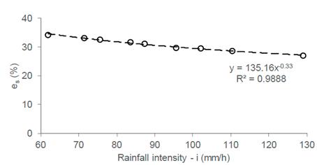 The increase in rainfall intensity for the same inlet flow conditions implies a decrease in system efficiency but allows an internal alignment of the preferential pattern of flow on the road to be preserved. This is represented by unit discharge.