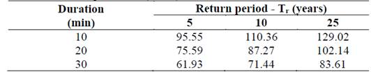 Colombian National regulations define the design rainfall for a return period of 5 years for contributing areas as below 10 ha, and 10 years for areas as between 10 and 1000 ha. The rainfall intensities for durations of 10, 20 and 30 minutes and return periods of 5, 10 and 25 years are presented in Table 1.