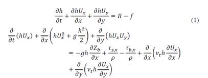 Where h is the depth, U x and U y are the horizontal velocities averaged in the depth, g is the acceleration of gravity, ρ is the density of water, Z b is the bottom elevation, τ s is the friction on the free surface produced by wind, τ b is friction of the bottom and ν t is the turbulent viscosity. The mass balance is complemented by rainfall intensity (R) and infiltration rate (f).