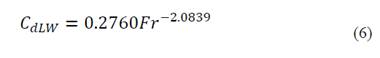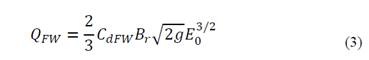 The total inlet flow is calculated by adding together the frontal flow and the lateral flow. Both are modeled using a weir equation. For frontal inlet flow (𝑄𝐹w), Eq. (3) is used in which the coefficient of frontal discharge (𝐶𝑑fw) is computed with Eq. (4):