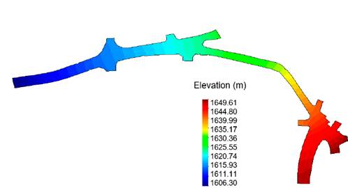 The Iber model permits turbulence closure models and the definition of turbulent viscosity by means of different methodologies [12]: constant turbulent viscosity, the mixing and parabolic length model and the κ-ε model of Rastogi and Rodi. Differences between the results of these turbulence models and their absence in the hydraulic calculation is minimal, which indicates that the supercritical flows developed are highly influenced by the friction of the bottom and not by processes of mixing the turbulent stresses.
