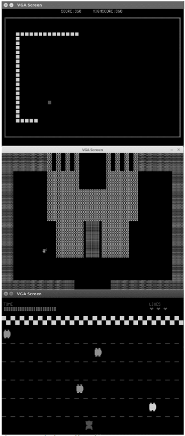 This part was implemented in assembly and for the game part students were allowed to choose a simple game to implement, only one level was required. Among the games chosen by students are: Tetris, Pong, Pacman, Snake, Adventure. Fig. 7 shows screenshots of some of the games implemented by students.