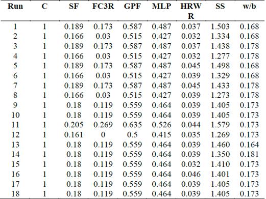 Hence, four responses were considered, including compressive strength with standard curing conditions at 24 hours (R1), 7 days (R7), 28 days (R28), and spread flow (Ø m ).