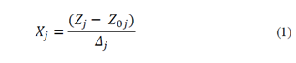where X j is the coded factor level, Z j is the real value of the factor, Z 0j is the real value of the factor at the center point, and Δ j represents the difference between the maximum and the minimum values of the factor considered in the factorial design.