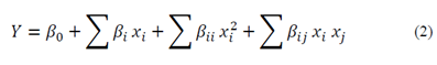 where Y is the estimate of the response (i.e. dependent variable), β 0 is the overall mean response, β i are linear coefficients, β ii are quadratic coefficients, β ij are interaction coefficients, and x i , x j represent the chosen factors or independent variables [1,3,17].