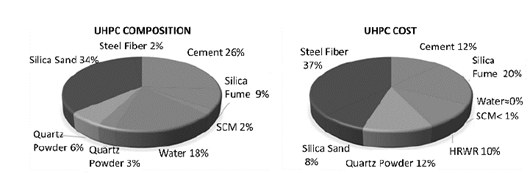 However, in terms of sustainability, this class of material must still be evaluated regarding its higher average dosage value of binder compared to the regularly used mixtures [7]. A typical UHPC mixture contains Ordinary Portland Cement (OPC), silica fume (SF), quartz powder (QP), fine-grain silica sand (SS), not exceeding 600 µm, a low water-to-binder ratio (w/b), high range water reducer superplasticizers (HRWR), and possibly steel fiber [12-14]. The inclusion of steel fiber will improve the ductility, tensile, and flexural capacity of the mix [10,15]. Abellan et al. [8] showed the composition of an average dosage UHPC mixture of 150 dosages from scientific articles, sharing some characteristics: such as compressive strength over 150 MPa without heat treatment, maximum size of aggregate between 0.5 and 0.6 mm, and 2% of steel fiber content in volume. This dosage and the cost implication of its components is depicted in Fig.1.