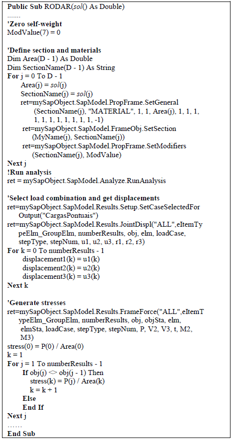 where N is the total number of analyses or evaluations of the fitness function in a given computer run for a predefined number of MITER iterations. Commonly, a given example is executed at least ten times [2-6] in order to verify the robustness of the algorithm, i.e., the obtained results should not change considerably from run to run. Furthermore, the total number of analyses in eq. (13) should be multiplied by the number of computer runs in order to assess the overall number of evaluations in a given optimization problem. During the analysis process, the coupled algorithm VBA-SAP 2000 proved to be time consuming, e.g., the optimization of a simple planar truss conformed by 10 bars with 400 iterations, and for one computer run took almost 4.5 hours on an average desktop computer. The excessive computational time reported by SAP 2000 is linked to the execution of other functions such as the creation of result tables, reports, display of deformed configurations, etc., all of which cannot be disabled during execution and are time consuming. This truly constitutes a limitation, which can be surpassed by means of parallel computing. Indeed, a similar conclusion is reported by Ghozi and co-workers [12], in which SAP 2000 was coupled to genetic algorithms for truss optimization. The advantage of the coupling is better highlighted when various PCs are used. It is inferred that the use of one single computer can still be allowed for some examples, but it can be forbidden for others. To speed up the validation process of the optimization tool, another conventional computer subroutine to solve truss structures was also coded together with the ABC algorithm. Corresponding comparisons and execution times for these two options are properly discussed in section 4.