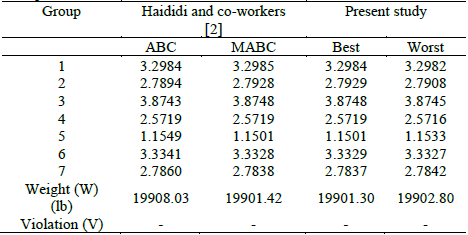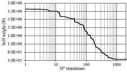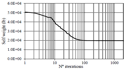 In addition, these results are also compared with other results [2], and then a good match is found for the final weight. The optimization history of the weight is depicted in Fig. 9. As may be observed, only 100 iterations are needed to practically obtain an optimized weight of 19901.3 lb (88.52 kN) without any violation of constraints.