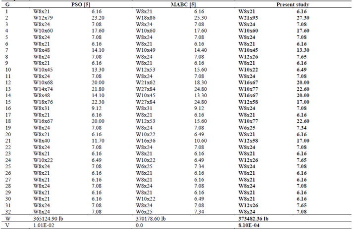 Table 2 displays 140 I-shape steel commercial sections obtained from the AISC database considered for the current optimization. The considered cross section areas are within the established minimum and maximum values of 6.16 in2 (39.74 cm2) and 215 in2 (1387.09 cm2), respectively. Fig. 11 displays the weight evolution of the tower with the increment of iterations. As may be observed, the convergence ratio to the optimal solution demands at least 2000 iterations to attain a stable solution. Meanwhile, the final optimized steel sections according to each group are listed in Table 3. Also, results of reference [5], in which a modified version of the ABC algorithm called MABC along with the results obtained from the Particle Swarm Optimization (PSO) algorithm, are presented for comparison. As expected, the current result of 373482.36 lb (1661.33 kN) is very close to the results reported in reference [5]. However, an excessive computational time is reported for the current example, in which only a single execution is performed. This resulted in a small violation of the imposed constraints of 8.1E-04. It is further believed that by using more iterations in the computation, this violation will be eliminated.
