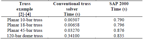 In this section, execution times for the coupled algorithm ABC-SAP 2000 are discussed for various benchmarks. For all examples a maximum population of 50 bees with a maximum number of 2000 iterations at each computer run is adopted. The efficiency of the numerical tool in terms of computational times is displayed in Table 4. All the analyses have been carried out in sequential executions by using a single computer with the following characteristics: Intel Core i5 processor with four cores of 3.10 GHz and 8GB RAM memory. The results correspond to the average times required for the evaluation of one objective or fitness function for various well-known examples found in the specialized literature [2], [4]. As can be seen, SAP 2000 computational times are greater than those from the conventional subroutine used to solve the truss problem. Nevertheless, SAP 2000 computational times are nearly constant independently of problem complexity. Conversely, the execution time increases for the conventional subroutine. This is explained because as the complexity of the problem increases, i.e., the number of unknowns augments, the SAP 2000 solver of linear equations is more efficient than the solver of the conventional subroutine. But, in general it is clearly stated that to take complete advantage of the implemented tool, parallel computing is required to speed up the process. For instance, the required computational time for the optimization of the dome truss for one single run in SAP 2000 is approximately (50/2+2000×50)×0.835/3600 = 23.2 hours (almost a day) for 2000 iterations and 50 bees according to eq. (13).