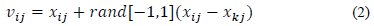 where k = 1,2,…NS and j = 1.2…D are randomly chosen indexes. It must be noted that subscript, k, in the last term of eq. (2) must be different from subscript i and rand [−1,1] represents a random number between -1 and 1. Values of v ij , which exceed their limit values, are set to their limit values.