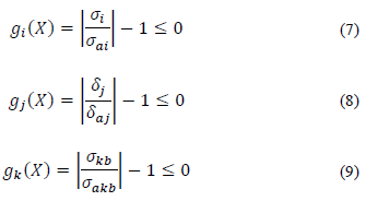 where subscripts are i, K =1,2,3,…NM,j =1,2,3…ND, and other parameters such as NMand ND represent the number of elements in the truss and the number of degrees of freedoms, respectively. In eq. (5), X is a candidate solution, X min_n and X max_n are the upper and lower limits of the design variable x n , and D is the total number of design variables. That is, x n represents the cross section area A n of the nth element, whereas g i ,g j and g k are the normalized constrained functions due to yield stresses, nodal displacements, and buckling stresses, respectively. Here, σ ai is the current stress in the ith element, σ ai is the allowable stress in the same element, δj is the displacement in the direction of the degree of freedom j and δ aj is the allowable displacement in that direction. Finally σ kb is the compressive stress in the kth element and σ akb is the associated allowable buckling stress. In this manner, the penalty function is defined by means of eq. (10)