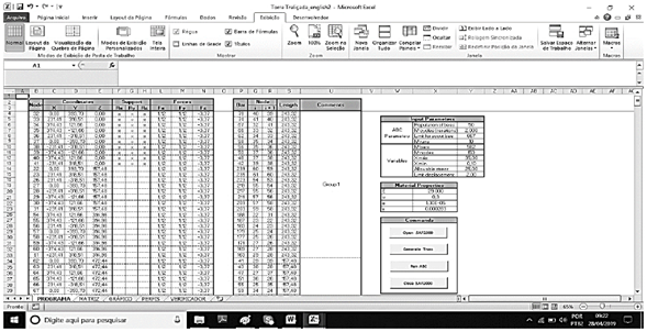 Nodal coordinates are defined in columns C, D and E of the current Excel spreadsheet for global coordinates along X, Y and Z directions, respectively. Meanwhile, corresponding restrictions are identified by a symbol “x” in columns F, G and H. Concentrated forces are specified in columns L, M and N for the loaded nodes. Furthermore, truss material properties are input into the table shown in Fig. 4, where E is the elasticity modulus of the material, v is the Poisson coefficient, α is the thermal coefficient and γ is the material density, whereas element connectivity is registered in columns Q and R in the table shown in Fig. 5. Finally, input parameters for the ABC algorithm are displayed in Fig. 6. For all the aforementioned data, units are input consistently.