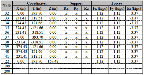 The previous dome structure depicted in Fig. 8 is optimized in this section via continuous variables. The dome geometry can be described by three rings in the following manner. The first ring, which passes by all supports at the base of the dome, has a diameter of 1251.02 in (31.77 m) with zero elevation from ground surface. The second ring, which is located at 118.11 in (3 m) from ground surface, has a diameter of 984.252 in (25 m). The third ring has a diameter of 546.61 in (13.88 m) and is located at a height of 230.315 in (5.85 m) from the ground surface. The last node in the dome is the highest one with 275.591 in (7 m) in elevation and is submitted to a point load of -13.49 kips (-60 kN). Other point loads of -6.744 kips (-30 kN) and -2.248 kips (-10 kN) are applied at nodes passing by the third and second rings, respectively.