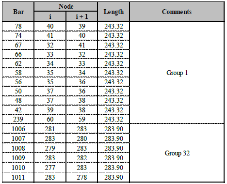 In total the dome has 37 nodes and 120 bar elements, all of which have been categorized in seven different groups. Bar elements of group one are defined by the connectivity of the highest node with those passing by the third ring. Groups two and five are defined by members located in the plane of the third and second rings, respectively. Members of groups three and four join elements from the second and third rings, respectively. Finally, elements from group six and seven join the supported nodes with those of the second ring. The minimum allowable cross section area of each member is limited to 0.775 in2 (5.0 cm2). The allowable tensile stress is 0.6 f y and the compressive stress is constrained by means of eq. (14).