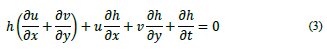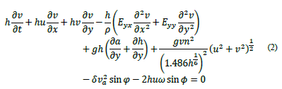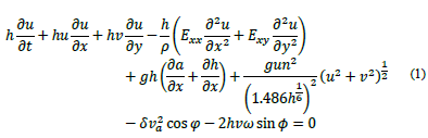 where, h is depth, u, v are velocities in the Cartesian directions, ρ is density of fluid, E is eddy viscosity coefficient, g is acceleration due to gravity, n is Manning’s roughness, δ is empirical wind shear coefficient, v α is wind speed, φ is wind direction, ω is rate of earth’s angular rotation and 𝜙 is local latitude.