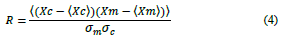 With Xm the set of measured values and Xc the set of calculated values; σm and σc are the standard deviations of measurements and predictions respectively, < > denote average.