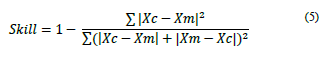 Xm be a set of N observed and measured values, and Xc be a set of N calculated and predicted model values. X̅ is the average of the modeled or measured variables. The use of this statistic has some disadvantages; relatively high values (more than 0.65) of "Skill" can be obtained even for poor model fit, which leaves a narrow range for calibration, therefore, this should be used along with other statistical techniques to judge the accuracy of the prediction [24].