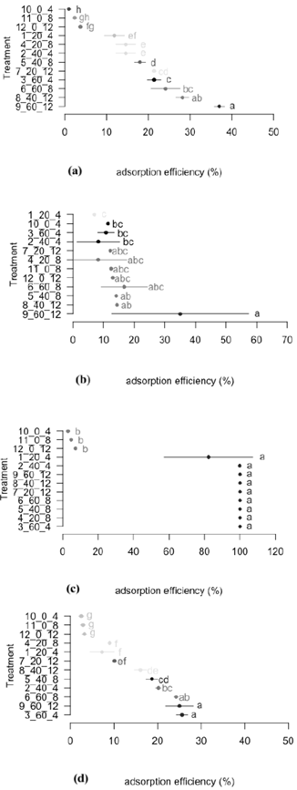 No meaningful statistical differences were shown in the treatments from 1 to 9, in the adsorption of lead with activated carbon, in comparison to the treatments 10, 11 and 12 (check tests) (Fig. 2c). From the treatment 3 to 9, a removal of lead was obtained of 100% showing the effect of the adsorption of activated carbon over lead, in relationship to the check tests, in which meaningful statistical differences were shown, with a maximum of adsorption of 7%.