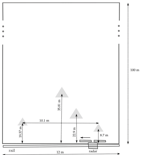 For testing the synthetic aperture radar prototype, we arranged a rectangular polygon of 12m x 100m with four corner reflectors in it as shown in Fig. 9. On one of the shorter side of this polygon, we installed the radar on a rail at a height of 1.2 m above ground, and we slid it following a stop and go scheme whilst taking samples of the echo received every 10 cm.