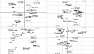 Figure 2: Factorial planes comparison: complete data, iMCA with 10%, 20%, and 30% of NA.