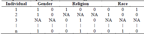 MCA is widely used in the analysis of surveys with questions that must be answered with only one of several options [13]. The answers to these types of questions generate qualitative variables (nominal or ordinal), each of which are associated with splitting the individuals (disjoint groups of individuals). When a question is not answered, nonresponse (NR) or missing (NA) data are generated.