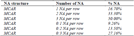 Table 3 shows the proposed simulation scenarios, which have a missing completely at random (MCAR) mechanism. At the same time, the scenarios when the entire data matrix has 1, 2, or 3 NA per row are considered. In the first three scenarios, the marginal per row Z i is constant for every i. However, when there are from 0 to 1, 0 to 2, and 0 to 3 NA per row, the marginal per Zi is not constant for every i. It is important to mention that the marginal per column is not constant for the j categories.