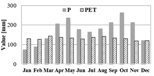 Figure 2: Average monthly P (mm) and PET (mm) in the MCRB