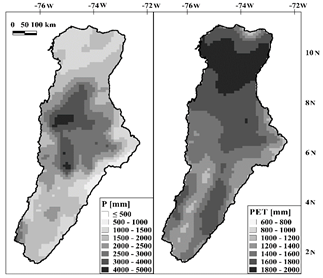 Figure 3: Distributed maps (based on in-situ data) of annual mean P (mm) and PET (mm) in the MCRB
