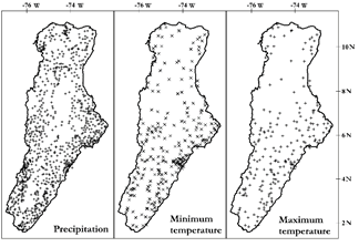 In situ information, used as a benchmark was provided by the Institute of Hydrology, Meteorology and Environmental Studies of Colombia (IDEAM, for its acronym in Spanish). It included daily time series of precipitation (905 stations), maximum temperature (468 stations), and minimum temperature (259 stations), whose location is shown in Fig. 4.